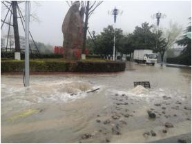 不到10分钟,应急抢修队员迅速到达南湖广场。现场发现有大量泥沙被水冲出,这说明漏水点附近地基可能已被水流淘空。为防止发生人员安全事故,抢修人员冒着大雨站在现场,提醒过往车辆和行人绕行。经现场仔细勘查,抢修人员迅速制定维修方案,并投入到紧张的抢修工作。