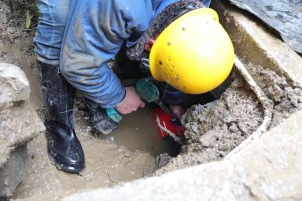 因漏水量大,工作人员来不及更换雨鞋就紧急关阀止水,为了让抢修速度更快,师傅们直接跳到1米多深的水泥坑里用锹、铲等各类工具开挖漏点;拆卸、安装、焊接,一刻也不停歇;抽干积水,清理路面。大家分工协作,经过四个小时的奋力抢修,终于维修完毕,开闸通水。此时,抢修人员的衣服、鞋子早已被水浸透,寒风中,大家冻得瑟瑟发抖、双手麻木通红,但他们每个人的内心都充满了欣慰,因为他们在这个飘雪团圆的小年里,又一次用实际行动给居民群众送去了“放心水”。