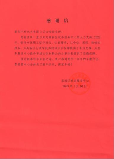 1月20日,襄阳中环水务有限公司云湾营业所收到来自高新区政务服务中心的感谢信,信中对云湾营业所2022年展现出的责任担当,以及冲锋在前、闻令而动的优质供水服务给予充分肯定与高度认可。