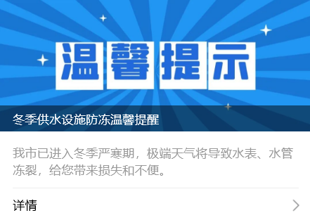 襄阳中环公司呼吁广大用户在极寒天气再次来临之际,积极配合,采取防冻保暖措施,共同抵御寒流,保障正常用水。